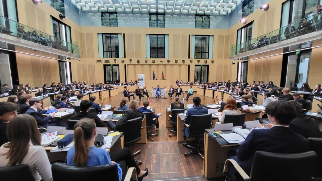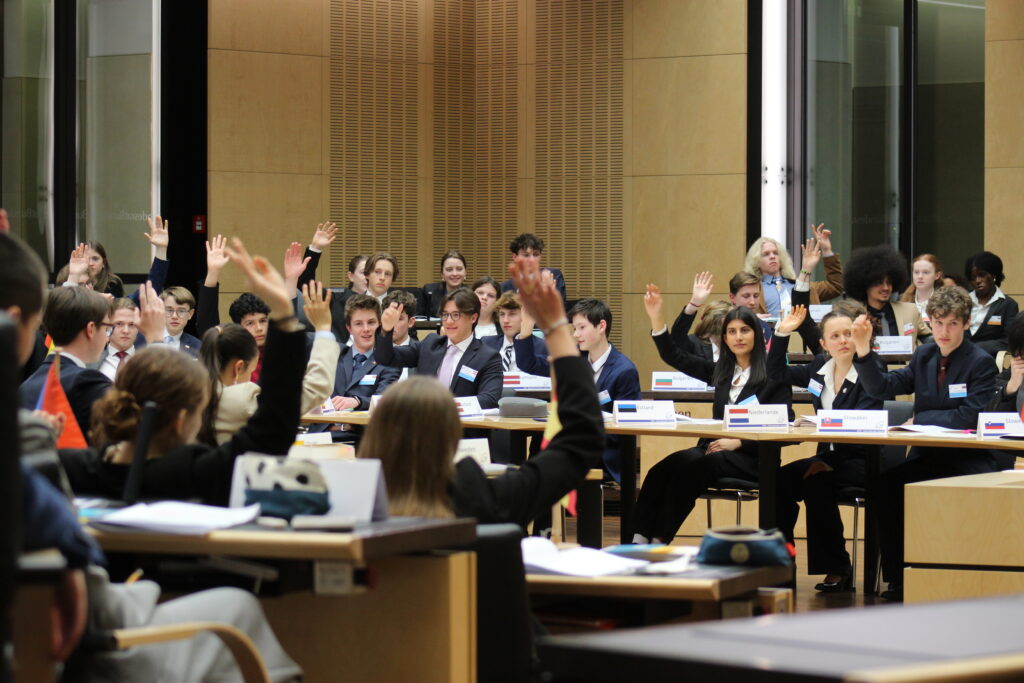In Ausschüssen diskutieren die Teilnehmenden aktuelle europäische Themen, erarbeiten Resolutionen und stimmen in der Plenarsitzung darüber ab – ganz wie im echten Parlament.